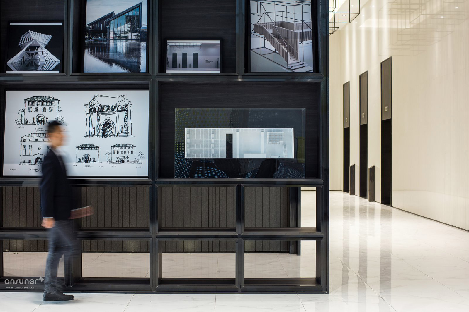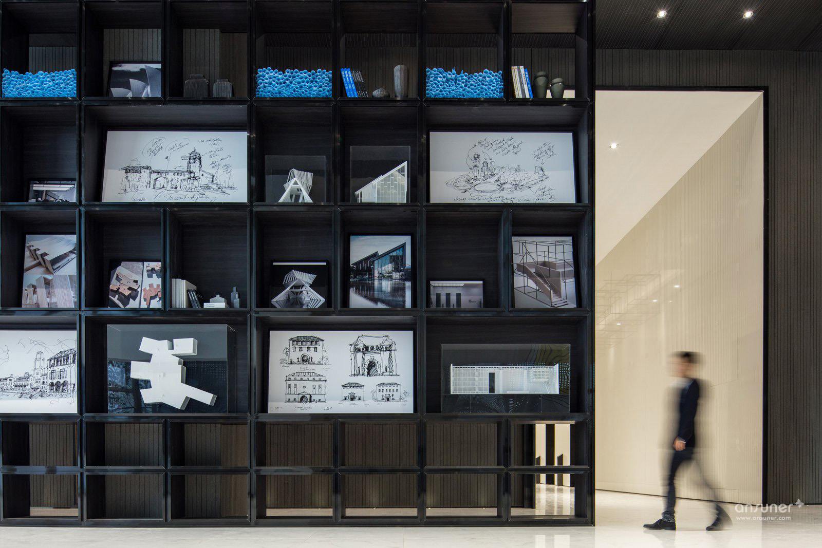 值得一提的,是大堂的立面展示架。ULD将万科过往优秀作品的设计手稿,效果图、建筑模型,以及施工蓝图图纸作为展示元素,以亚克力封箱,结合一些超现实感的建筑模型做出装置一并展示,将万科的设计理念和设计公社的设计精神做了很好的呈现,打造出一个高品质的品牌展示区域。