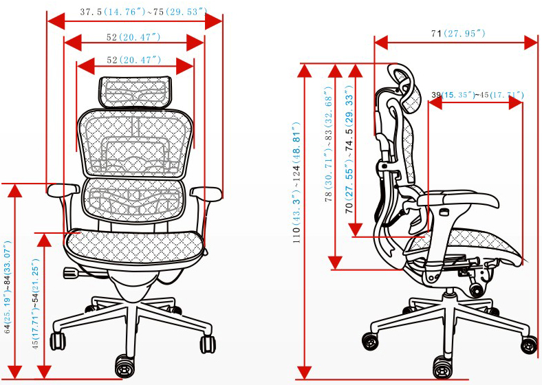 头枕、背垫、腰枕及座垫均为进口网布;黑色塑胶框架,PU扶手垫;塑胶头枕插条、头枕横把手;背支撑架、底盘支撑架均为铝合金精抛光;100MM气压棒,340MM铝合金精抛光椅脚,60MM PU滑轮;