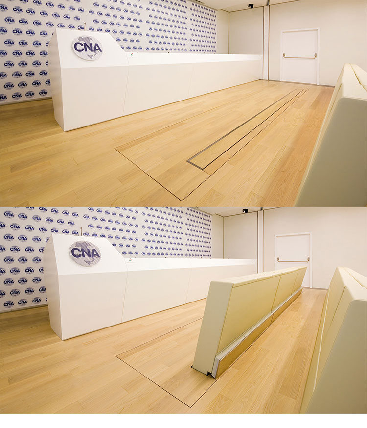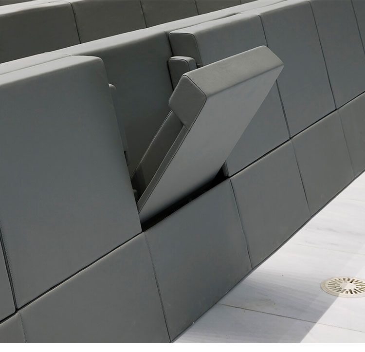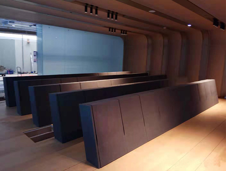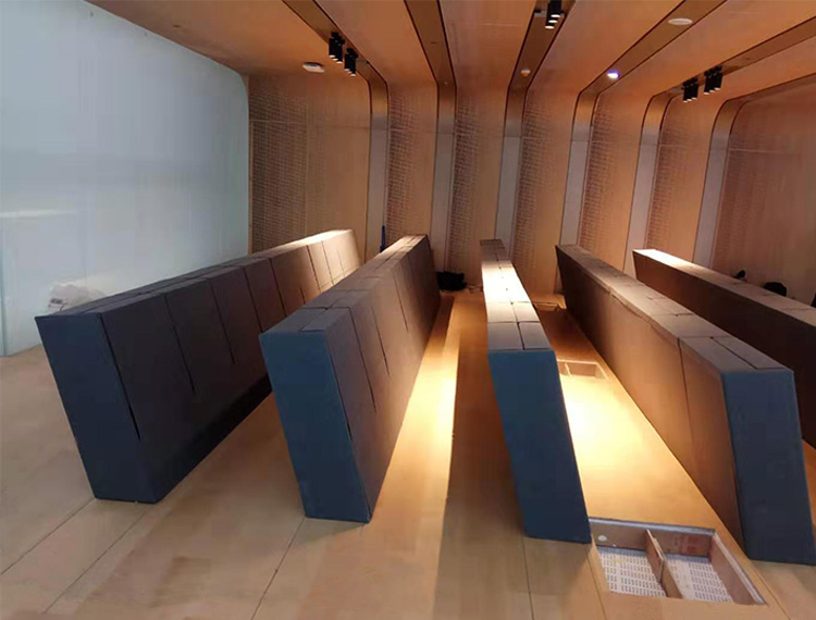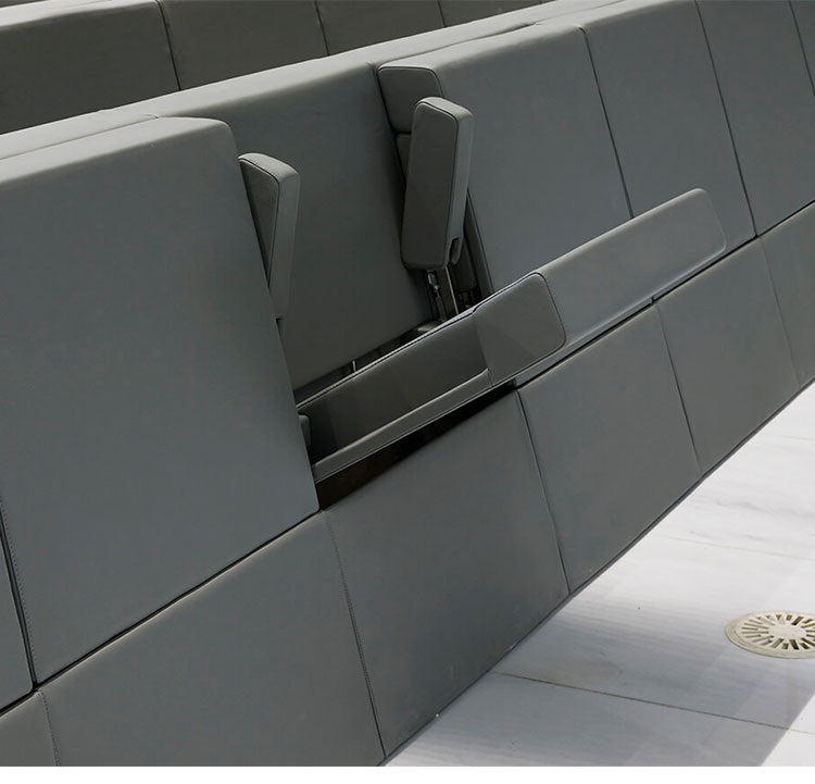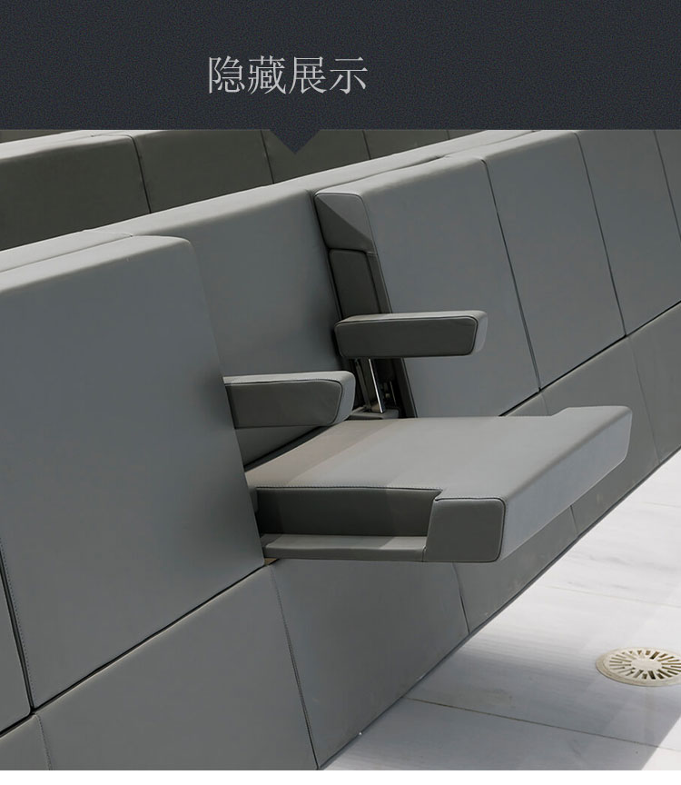 1. 椅背:采用进海绵原料+"S"型弹簧钢架经模具冷发泡一体成型,外型按人体工程学原理设计,坐感舒适。整个海绵弹性高,无异味,甲醛释放量控制标准达到国际先进水平。 2. 椅座:采用海绵原料+"S"型弹簧钢架+中纤板经模具冷发泡一体成型,外型按人体工程学原理设计,坐感舒适。整个海绵弹性高,无异味,甲醛释放量控制标准达到国际先进水平。 3. 背外板:采用中纤板制作成型,面覆优质PCV或布料。 4. 侧板:采用中纤板制作成型,面覆优质PCV或布料。 5. 站脚:采用钢管、钢板切割焊接成型,后经喷涂处理。 6. 扶手:采用海绵原料+五金件+木结构经模具冷发泡一体成型。 7. 面料:采用PVC或布料。 8. 回复机构:采用气缸缓起立回复机构,扶手、椅座连动回复节约通道,以保证回复无故障、无噪声、经久耐用。 9. 地爆螺丝:采用不锈钢内六角膨胀螺丝。